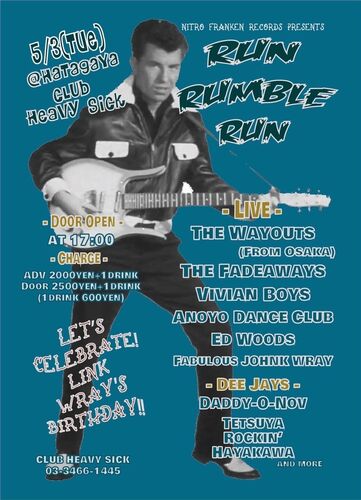 5/3(火祝) 幡ヶ谷Club Heavy Sick NITRO FRANKEN RECORDS presents “RUN RUMBLE RUN” 【LIVE】 The Wayouts The Fadeaways Vivian Boys Anoyo Dance Club Ed Woods Fabulous Johnk Wray 【DJ】 Daddy-O-Nov Tetsuya Rockin Hayakawa and more Open : 17:00 A…